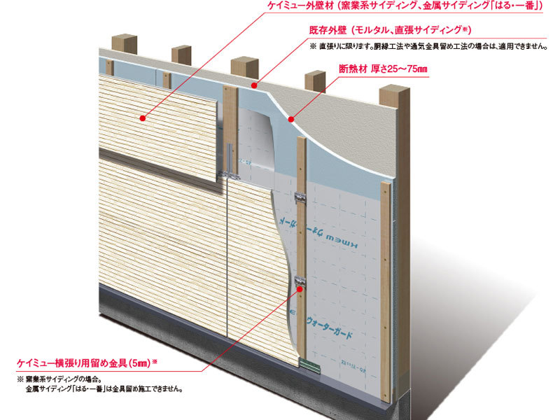 引用:重ね張り窯業系サイディング仕上げ図、外張断熱工法|外壁リフォームの工法|外まわりリフォーム|屋根材・外壁材・雨といのケイミュー(検索日:2020/8/16), https://www.kmew.co.jp/sotoreform/srkouhou/sotobaridannetsu.html