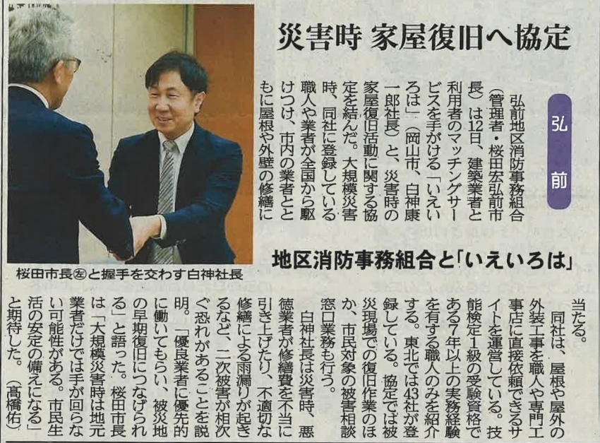 • いえいろはの青森県弘前市との災害時復旧協定が東奥日報で取り上げられました
