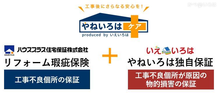 「やねいろはケア」は、国土交通大臣指定の住宅専門保険会社(ハウスプラス住宅保証株式会社)が提供する「リフォーム瑕疵保険」と当社が提供する「やねいろは独自保証」をセットにした有料保証サービスです。