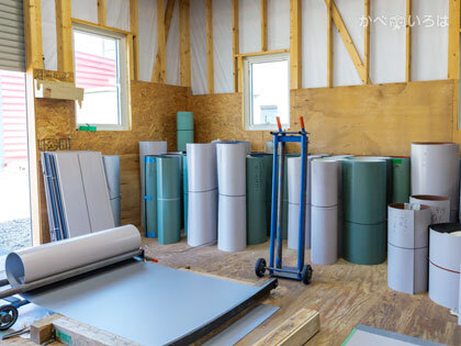 「昔の鉄板の壁材など、現在の規格外のものについては、自分たちで成形材や支柱を作って、現場のサイズに合わせてオリジナルの部材を製作します。物置や車庫は雪かきでの破損が多いんですよ。除雪機が接触して凹んだとかあるので、修理のニーズに合わせて板金を加工して雪に強い施工をします」